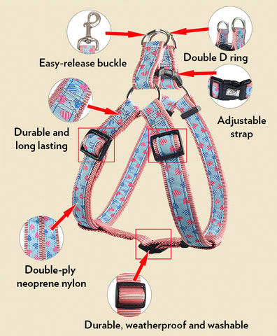 The Bulldog, Striped & Swan Reversible Harness is interchangeable between two unique printed sides, giving you two fashionable harnesses in one! You can quickly switch between a printed neoprene fabric harness and a printed mesh harness for double the fun!- Reversible Design